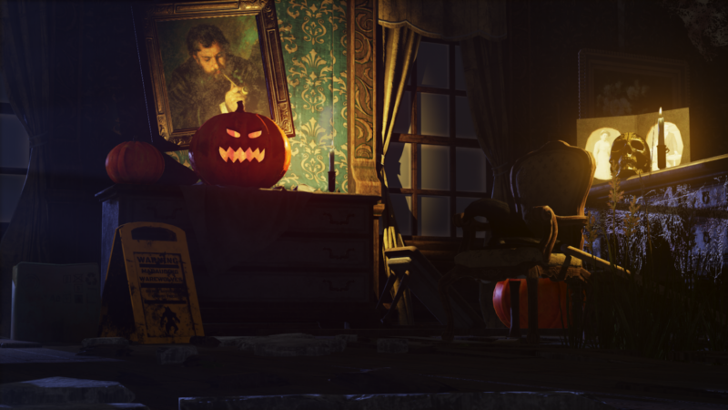 We really like the detail in this scene - and the strong silhouetting of the pumpkin and the skull. The stage, a spooky old house and a creepy old painting was a great touch ?