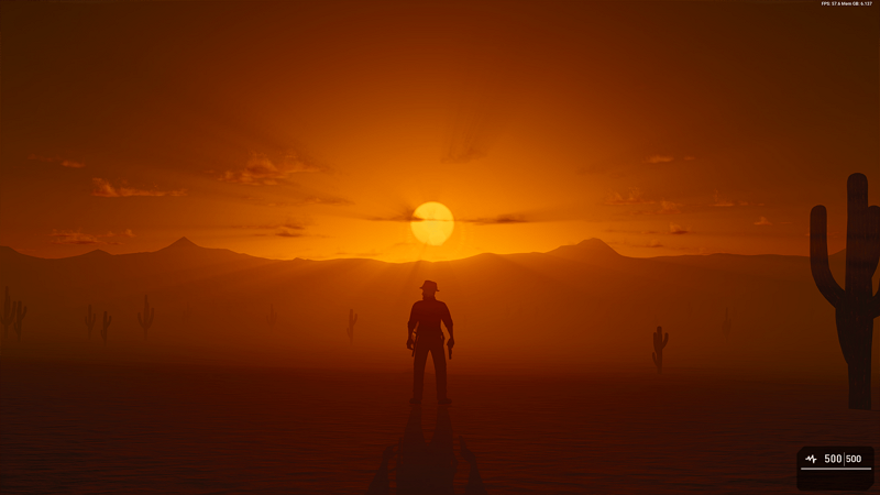 Right out of a western movie this screenshot uses the classic setting sun and long shadow trick. The silhouette of the gunslinger's hat and gun are a great touch. If this was a game you would want to check it out!