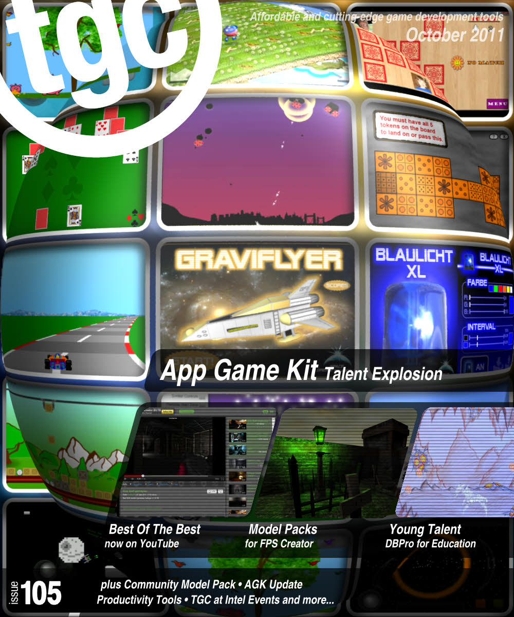 The ability to code games quickly is manifest in this issue. We have numerous reviews on many different platforms. Alongside these you'll find tools to simplify the production process further. With AGK users turning out huge numbers of games and ideas, it's easy to miss the new Model Packs for FPSC, My Doodle Game for the iPad, news from TGC at IDF, competitions and more.