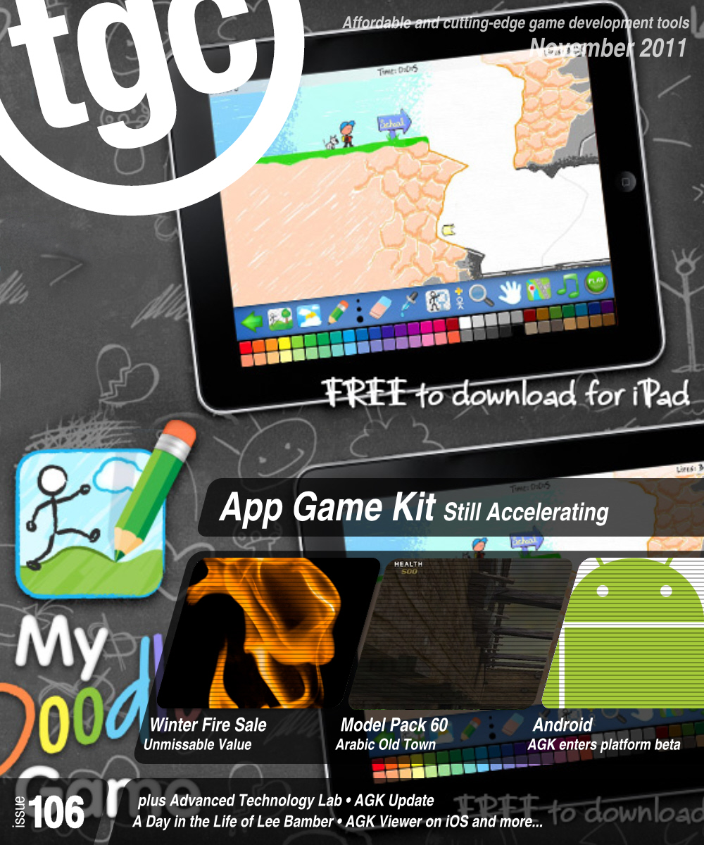 From my side of the AGK stable, I continue to improve the AGK IDE, Compiler, Player and Viewer and keep on top of the Issues Board during bug fixing cycles. I will continue to tweet interesting facts about AGK through my twitter account @leebambertgc and you will find that for the time being I will be reading and if required, answering every single thread in the AGK forum. I am also finding time to record and publish impromptu YouTube videos of various AGK topics as they become interesting. My last few videos included a brief look at how you can develop in the AGK IDE on a Mac, a quick look at multi-touch on the iPad and also a preview of the AGK Viewer, which allows you to run your AGK apps on your iPhone, iPad or iPod without the benefit of a Mac. As we develop new toys, or some interesting question surfaces through the Facebook or Forum threads, I will be sure to have my video camera handy to capture my take on things.