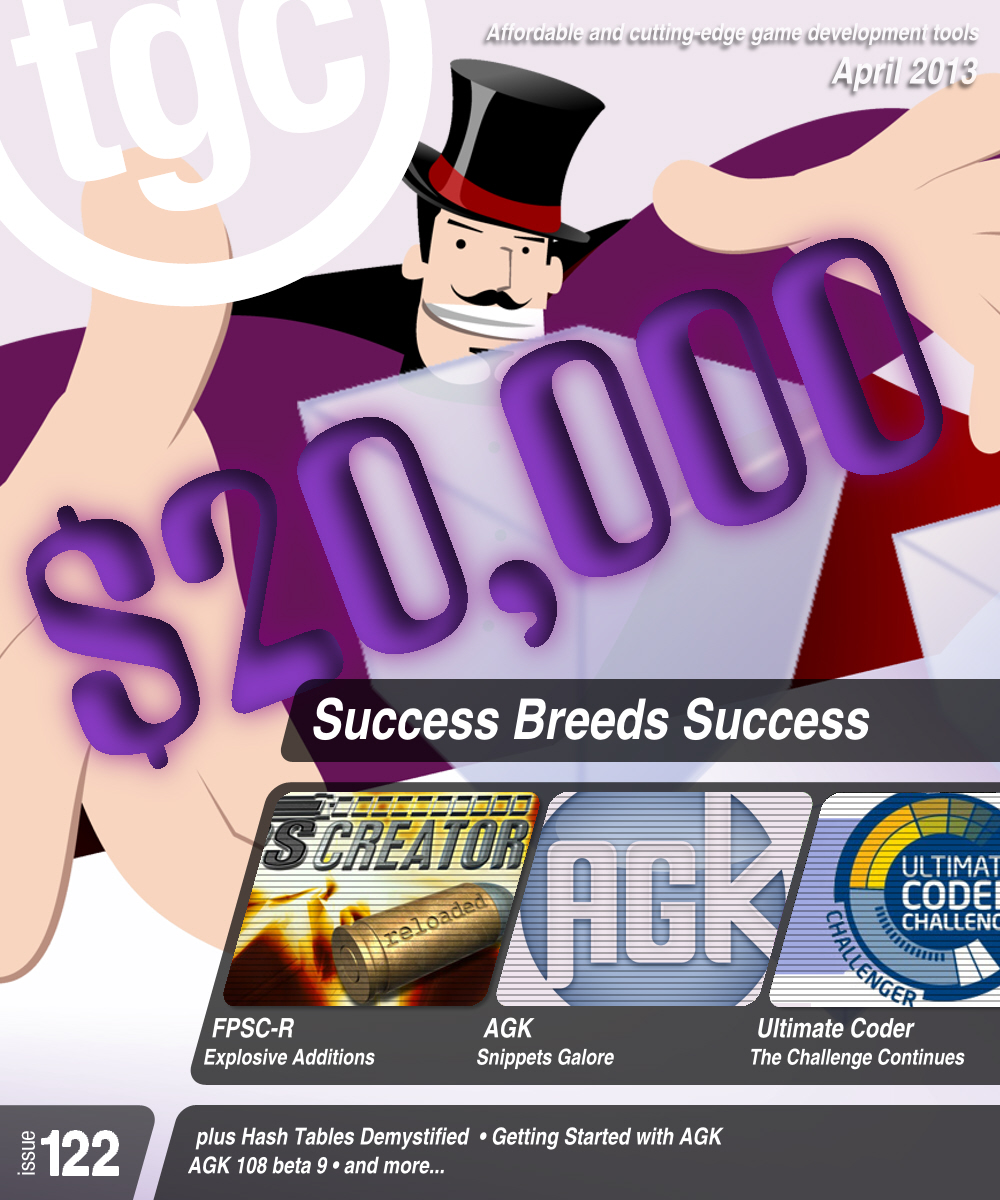 As coders and technophiles, we are more resistent to the unexpected. However, we all struggle to resist the onslaught of new gadgets, technology and everything it entails. This month we can anticipate the final strands of AGK 108 coming together and stabilising as we draw a line before any further advances catch the developers' attention. Lee continues to surprise us all with technologies not yet in the public domain. Our community amazes us with yet more major prize scoops in the international arena. Alongside,we have our usual collection of news and views to keep you entertained.