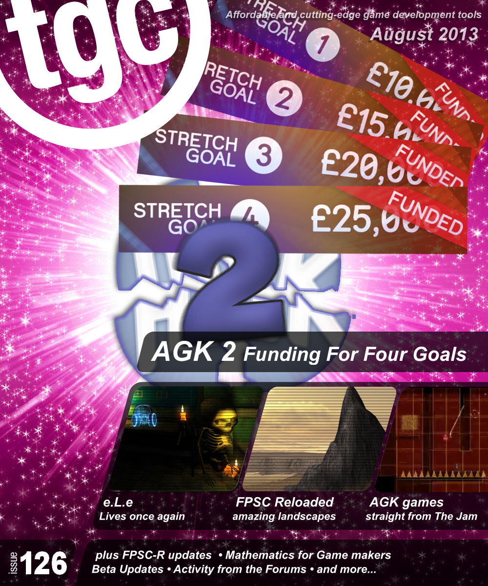 In keeping with the need to take it easy and recharge before the return to school, university or work, we've kept the reading nice and relatively thought-free. You can meander through the long list of features you'll find in AGK 2 thanks to your generous pledges. FPS Creator Reloaded wanders out into new worlds for you to absorb and delight over. We have games from numerous arenas including FPSC, AGK and even OUYA. Delve into the world of perceptual computing once again with a Case Study built around Lee Bamber's contest entry. And for anyone who wants to tax their brains a little more, we have mathematics for games developers.