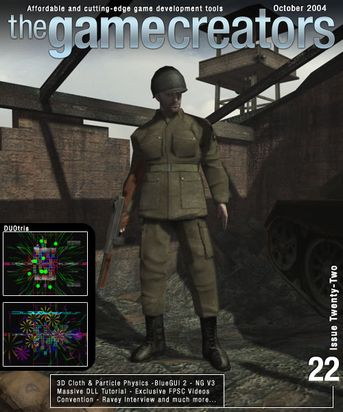Welcome to Issue 22! This is actually our single largest newsletter ever published, over twice the size of that released in October 2003. This I believe shows the quite remarkable changes that The Game Creators have gone through over the past year, and it just keeps on getting better! I don't know about where you live, but in this part of the world the weather is now decidedly horrible with stormy clouds, heavy rain and gusty wind being the norm. Which is great, because it's perfect coding weather! Instead of thinking you ought to be making the most of the sun, instead you can drive yourself deep into the guts of your latest program as the rain hammers the windows. That is just what we've all been doing here and you can see the fruits of it this issue. Dave (Ravey) Milton has finished the project he's been slaving on for the past 6 months and you can read an interview with him all about that. Work has also been full-steam ahead on FPS Creator and as promised last issue we have prepared an exclusive 7min walk-thru video for you! It is the easiest way to show you exactly what the program can do, even in its beta state. We also slapped a camera infront of lead FPS Creator developer Lee Bamber early one morning (not the best time for Lee :) and extracted his thoughts via some FPSC related questions, so you can watch the interview as well. Back in the land of DarkBASIC Professional there are no less than 3 new extension packs announced this month, one of which you may already be aware of (3D Cloth and Particle Physics). The other two being the excellent BlueGUI Version 2 and also a brand new version of the Nuclear Glory Collision System. There is also a new release of TreeMagik, a massive 20MB tutorial on writing DBPro commands in Pure Basic, an exclusive low-level vertex DLL, news from the forums, a great game review, competition details, special offers and more! So dive on in and enjoy the read. |