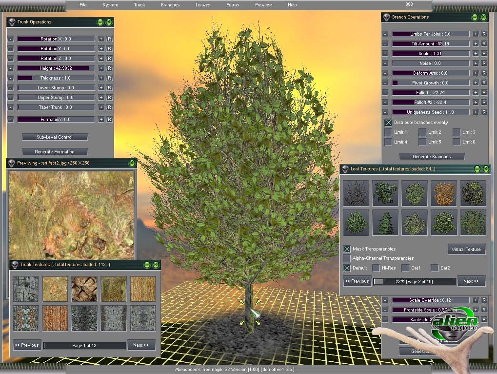 No longer are tree designers limited to prefabricated trunk mesh and leaf chunk designs, TreemagikG2 offers the designer an easy approach to building unique tree designs. By simply adjusting certain slider bars; the tree in the editor contorts to the new shape in realtime. TreemagikG2 offers controls for every aspect of the tree creation process; poly count, texture detail, texture creation, tree detail and more! If you are in need of 3d-polygonal mesh trees; whether it is for games creation, presentations, landscape design or simply for the fun factor - then TreemagikG2 is a product you cannot afford to pass up! Compared to other tree making tools, TreemagikG2 is the most cost efficient solution for the 3d-developer, at the same time producing high quality tree-mesh models. Key Features