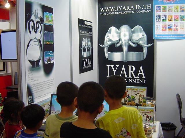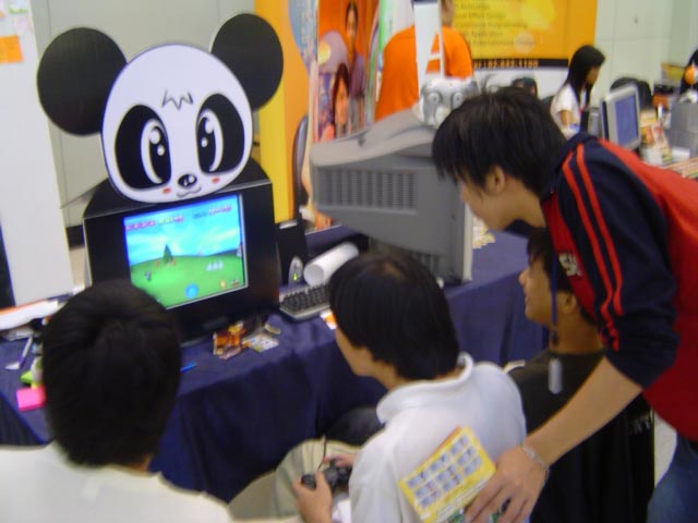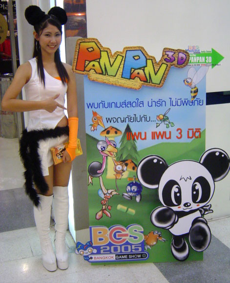 Here at TGC we were lucky enough to play an extended demo of PanPan3D and can confirm that even dispite the relatively low age-range of its target market, it's great fun! Each level offers something new, from piloting a submarine to charging around on Kokies back. There are an impressive 60 characters, 50 levels and 5 massive end-of-level bosses. Created by Wachirawoot Tacommie and Wasin Pirom the team created the entire game with DarkBASIC Professional for all of the code and MilkShape3D for character design. The full version has shadows, pixel shader effects and other techniques pulled from DirectX9 via DarkBASIC Professional. 3D Sound and cut-scenes before the play help create an interesting and advanced game. Just as E3 has their own selection of attractive females helping to perk interest from the passers-by, it isn't alone. Similar "sales techniques" can be seen at trade shows world-wide - even PanPan had his own PR girl at the Bangkok Game Show, the lovely Bow: