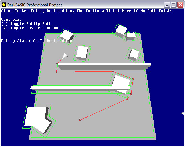 One of the most requested features for DarkBASIC Professional, along with physics were A.I. (artificial intelligence) commands. Commands that would help with pathfinding, and adding intelligent behaviour into your games, making opponents and allies smarter. To this end we're pleased to give you this sneak preview of the forthcoming Dark A.I. extension. Developed entirely in-house by our latest TGC recruit, Paul Johnson, Dark A.I. will offer developers the following abilities, implemented as native DBPro commands: