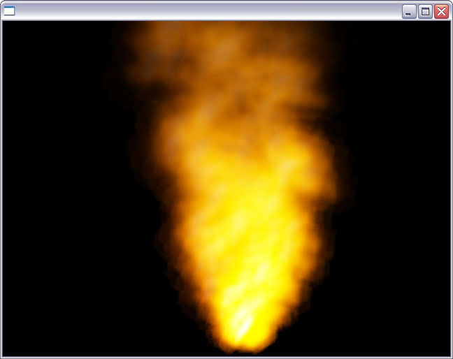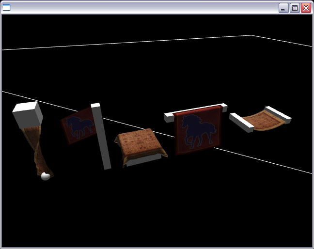 We've included some high-res versions of these pics, so you can make out what is going on better! Shot 1: On the left you can see the PhysX Cloth system in action. A cloth object (the rug) has been twisted around a column, drapped over a box, attached to a flag-pole and even strung between two beams, where it hangs and swings in the breeze [ view full pic ]. Shot 2: Welcome to Particles, the PhysX way! Here we've set a roaring fire into action. The flame and smoke particles drifting up into the air. Of course, being fully physics driven particles, if you were to now fly an object through them, they would swirl and distort accordingly [ view full pic ]. The final picture, Shot 3: demonstrates Cloth again. But this time we have increased the fragility of the cloth itself, and then let rip at it with a stream of bullets (sphere objects). As you can see, they have actually ripped a hole right through the cloth! Keep blasting for long enough and you can demolish the cloth into tatters [ view full pic ].