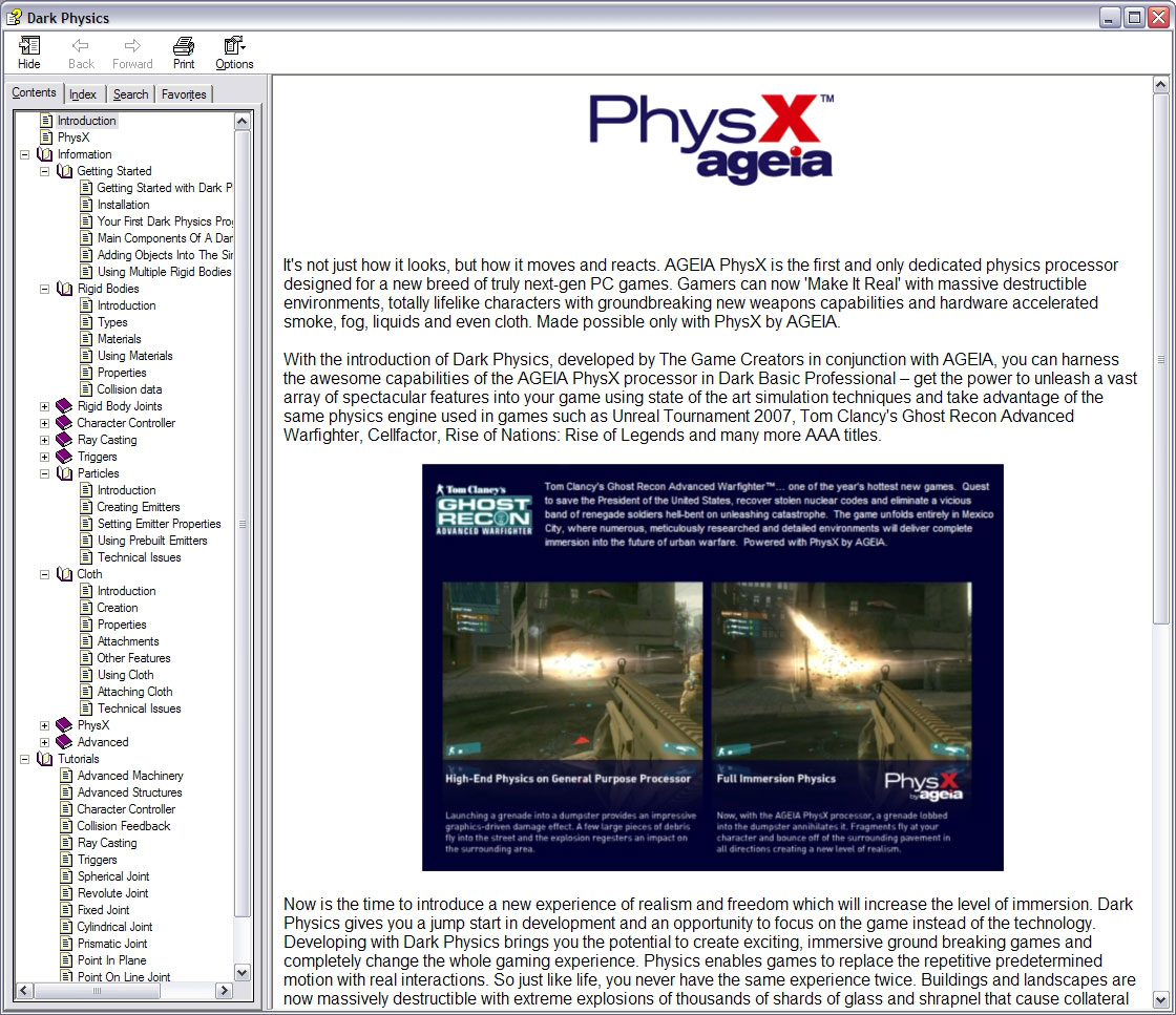 Over the past few months The Game Creators have been developing a brand new, exciting expansion pack for DarkBASIC Professional. This new pack titled 'Dark Physics' offers a fantastic opportunity to integrate the high-calibre AGEIA physics engine into your developments, that has the potential to completely redefine your gaming experience. You can now get the chance to utilise the same physics engine as used in games such as Unreal Tournament 2007, Tom Clancy's Ghost Recon Advanced Warfighter, Cellfactor, Rise of Nations: Rise of Legends and many more top class titles.