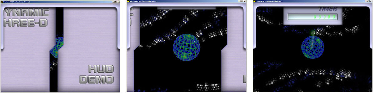 As always, it is important to carry out the labour-intensive tasks outside of the main program loop. We will create all of our HUD elements as a pre-game procedure. The process for creating each HUD item is enclosed in a function. This carries out all of the necessary steps required to make a 3D plain into a suitable HUD object, and create the associated tracking data: