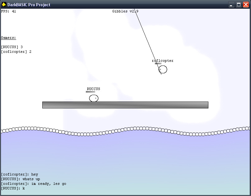 Adam Ice (aka Ruccus) has been working on a "medialess 2D sidescrolling online multiplayer fighter game". If that isn't a big enough mouthful to contend with, it has been affectionately named Gibble Blops. As well as playing against real opponents, you can make use of the in-game chat facility, which is a nice touch. Although it's still a work-in-progress, it has been successfully tested with 5 players. A small number of forum users have downloaded the game to help test, provide feedback and generally have fun, and I'm sure the author would welcome more volunteers. He is currently using the Tempest plugin, but at the same time is keeping an eye on Multisync and the Winsock 2.2 DLL too.