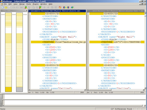 Finally, this is my preferred tool for inspecting output files, such as save-files. The screenshot shows this scenario, comparing an input XML file, with the output file. It indicates the lines that are mismatched, effectively highlighting bugs in the save routine.