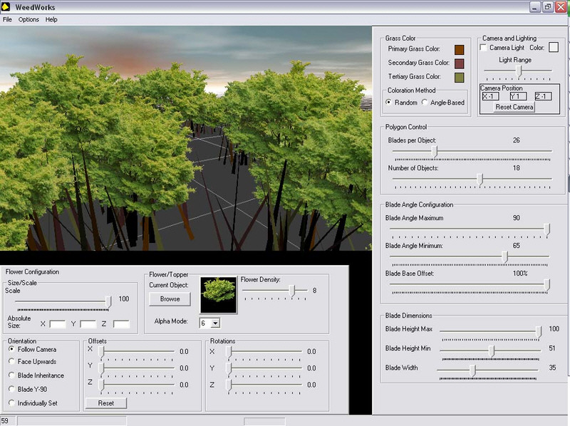 Weed Works is a fast-developing work in progress by Ethan D. Keiley, aka Alquerian. This freeware application is designed for rapid development of groundcover such as grass, weeds and other foliage. It has a multitude of options to create everything from a single blade to a landscape of extra-terrestrial, multi-coloured fields.