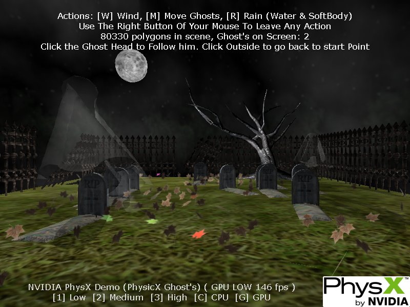 PhysX Ghosts by Waldemar MedinaFor a demo with atmosphere, look no further than the second place winner written by Waldemar Medina, depicting a spooky and haunted graveyard. Visuals are perfect, and the audio backdrop really adds to the scene. The scaling is good, and all the features we looked for can be found in the form of a dense downpour of fluids, soft body snakes, cloth ghosts and a rigid body simulation that pulls it all together. A very slick demo that shows how you can combine high end technology without sacrificing your theme or style. An excellent effort!