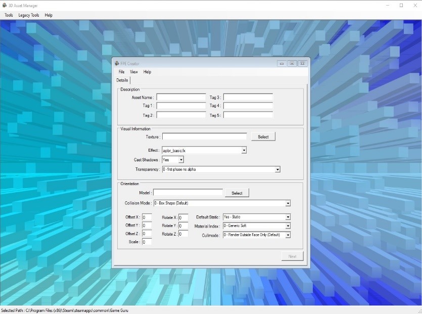 20 years later, bearing in mind he had little knowledge of VB, he decided to renew his Microsoft subscriptions and have a dabble with Visual Studio .NET. Although things had drastically changed he found his long lost interest in software development and thought that he could solve the issue of a large collection of assets with some kind of library manager. It wasn’t just the quantity of assets, the other hurdle was creating FPE files for them (FPE files are meta data files used by GameGuru to describe the properties of a game asset).
