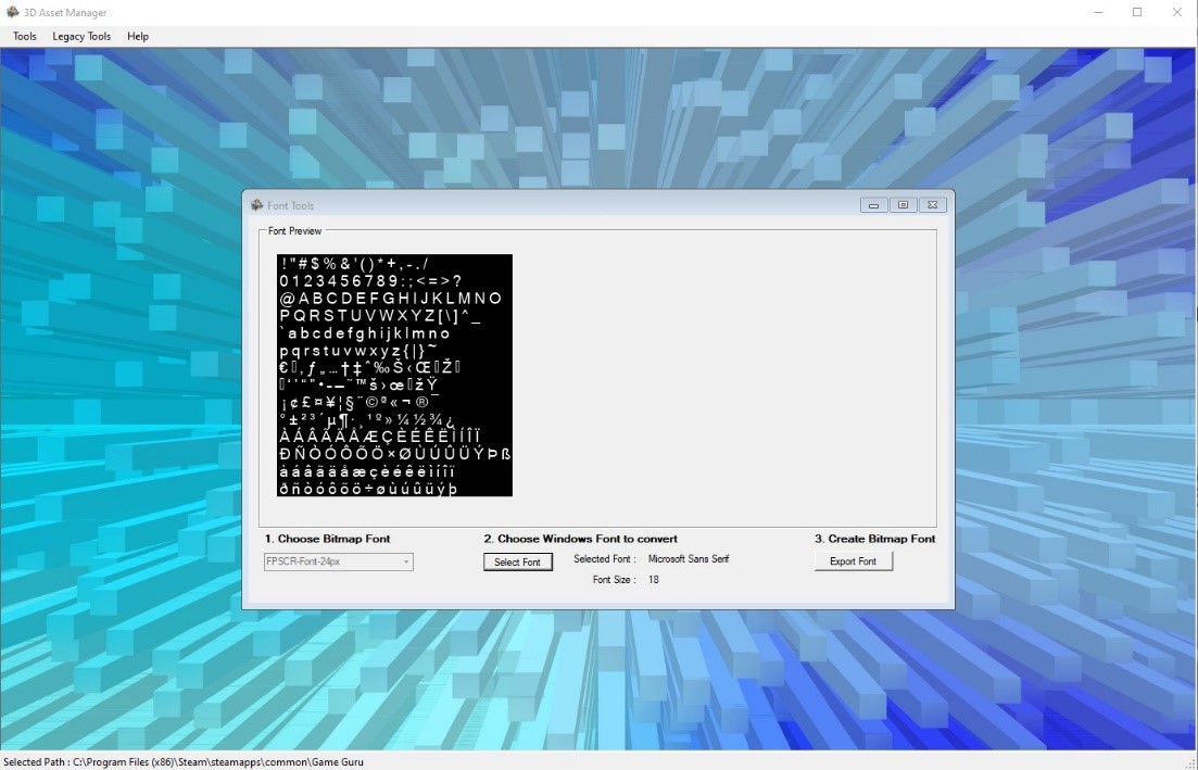Font to Bitmap was inspired by a fellow user on the AppGameKit forums, Thomas Gortler (fliphead). Thomas had created a tool called BitmapFontCreator back in 2012, and with his help and direction Kevan created Font to Bitmap. It’s a simple three step process - you choose the current GameGuru Bitmap font, then choose the windows font you want to replace it with and then export the new font. Most True type fonts work quite well but some are not so good. It’s trial and error to find the perfect font, and work is ongoing to improve the utility.