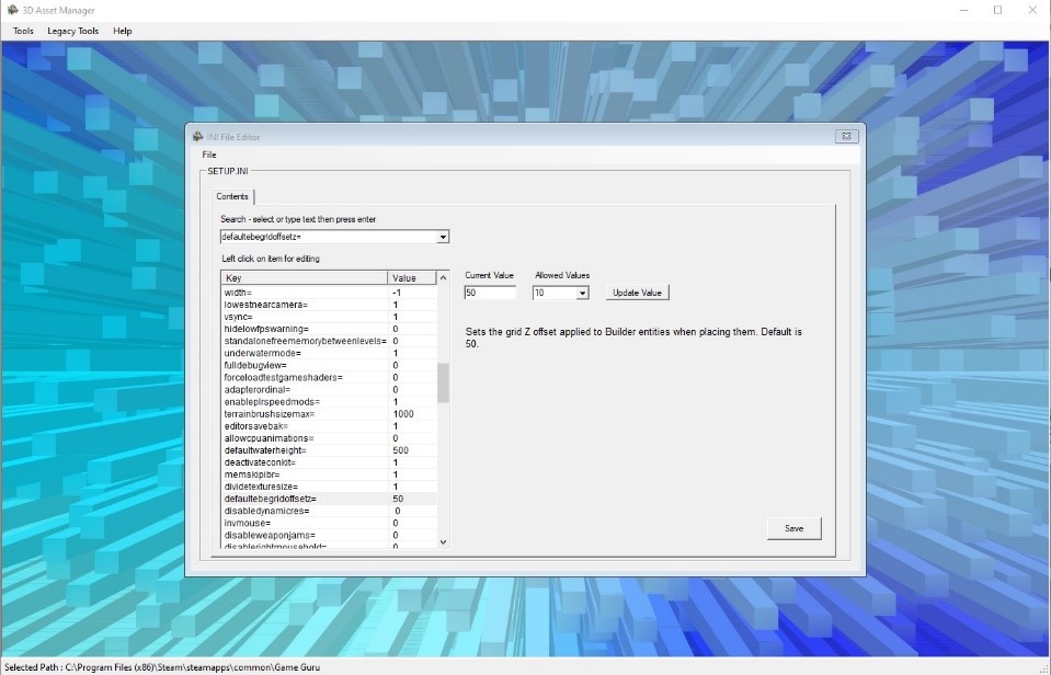 He didn’t stop there, next came INI editor which allows you to safely change settings in your setup.ini. It only allows the correct types and values to be changed and also backs up the default setup.ini automatically with a one click restore option.