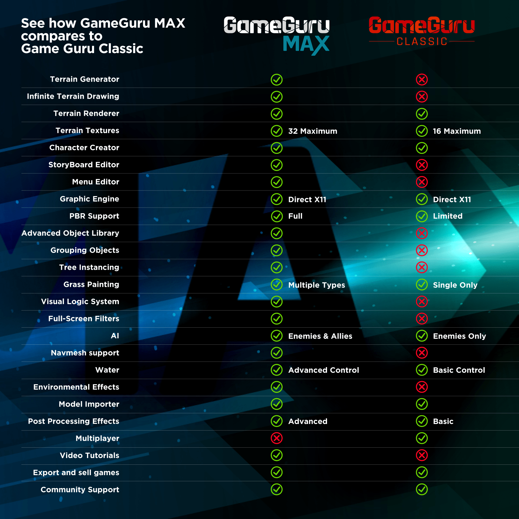 We hope that the free trial version gives a good insight into GameGuru MAX and we’ve also created a quick comparison chart so it’s easy to see the differences between GameGuru Classic and GameGuru MAX